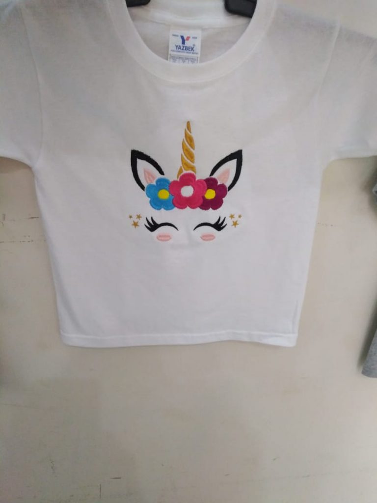 Playera cuello redondo para niña, con bordado de unicornio al frente en el centro. Pregunte a los num: 3-57-31-67 o