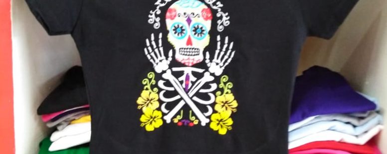 Playera con bordado enfrente de calavera en conmemoración al día de muertos.